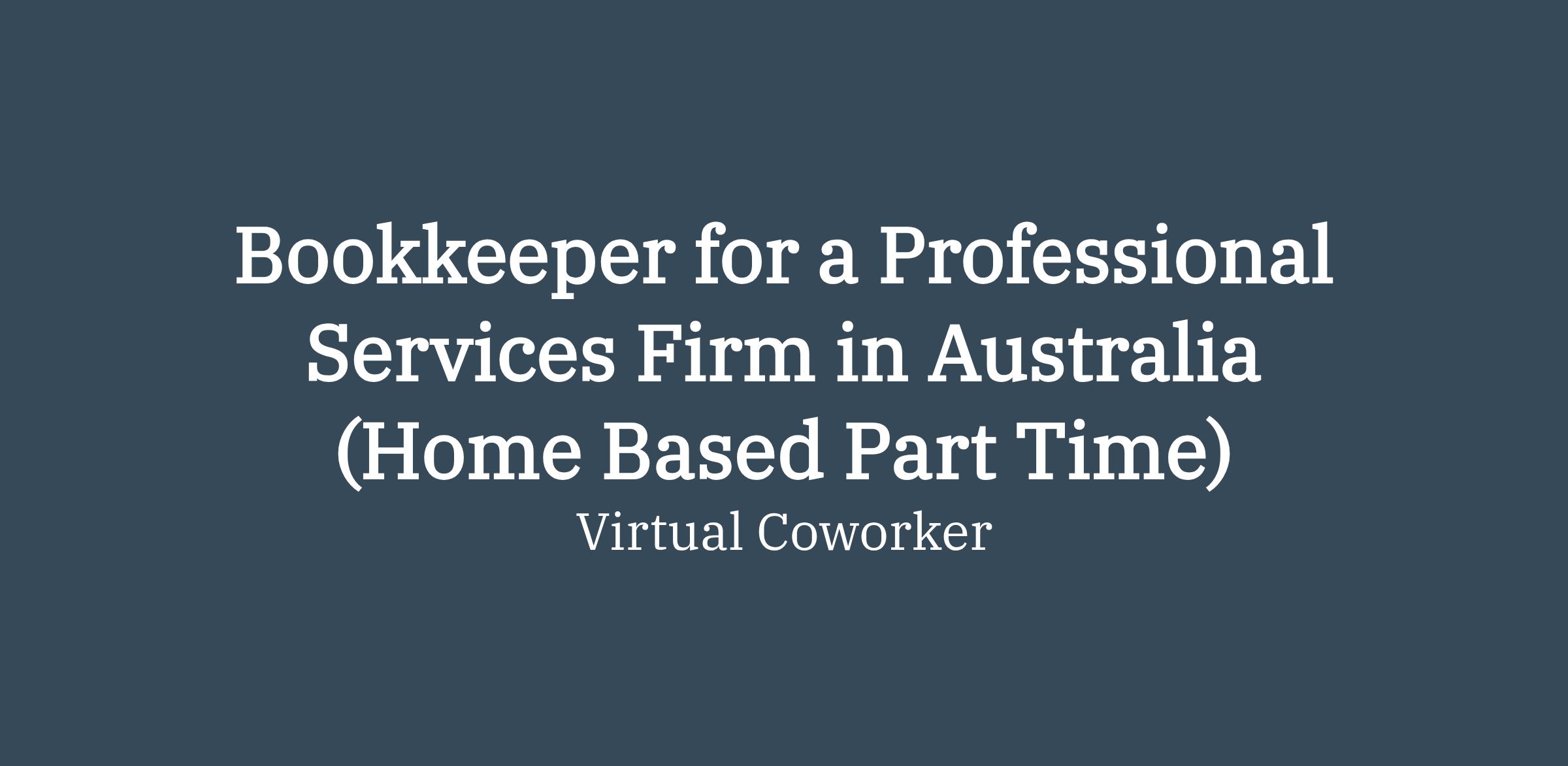 https:\/\/www.linkedin.com\/company\/virtual\-coworker"}],"isMobile":false,"iframe":"true","jobType":"Part time","applyName":"Apply Now!","zsoid":"8208015","FontFamily":"Arial, Helvetica, sans\-serif","jobOtherDetails":[{"fieldLabel":"Job Category","uitype":2,"value":"Accounting\/Bookkeeping"},{"fieldLabel":"Work Schedule","uitype":1,"value":"Monday \- Friday, 10:00 AM â 2:00 PM Australian Eastern Standard Time"},{"fieldLabel":"Hours Per Day","uitype":2,"value":"Part Time â 4 hours per day"},{"fieldLabel":"Industry","uitype":2,"value":"Financial Services"},{"fieldLabel":"Client Location","uitype":2,"value":"Australia"},{"fieldLabel":"Work Location","uitype":1,"value":"Home Based \- Philippines"},{"fieldLabel":"City","uitype":1,"value":"Barangaroo"},{"fieldLabel":"State\/Province","uitype":1,"value":"New South Wales"},{"fieldLabel":"Zip\/Postal Code","uitype":1,"value":"2155"}],"headerName":"Bookkeeper for a Professional Services Firm in Australia (Home Based Part Time)","widgetId":"147741000000390320","isJobBoard":"false","userId":"147741000000027001","attachArr":[],"customTemplate":"3","isCandidateLoginEnabled":true,"jobId":"147741000071223025","FontSize":"12","location":"Barangaroo","embedsource":"CareerSite","logoId":"idwop0ece2fcac21a443ba16938fb832bdc3b"}