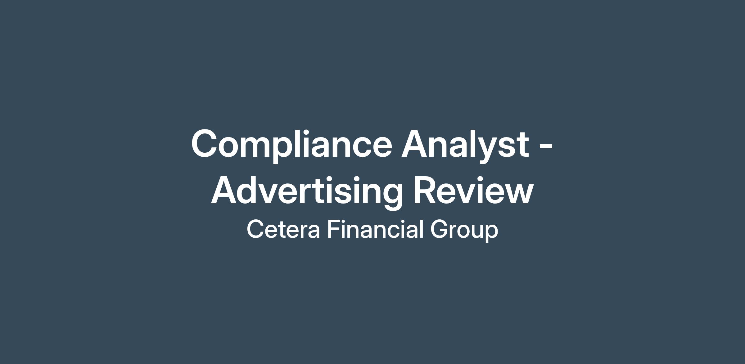 DescriptionCetera Financial Group is currently seeking a Compliance Analyst for Ad Review. This is a unique opportunity to join our team to ensure that all retail communication complies with state and federal laws, rules and regulations, and internal standards. This also includes Federal and State Insurance Regulations as well as FINRA and SEC Rules. This position will work in the areas of insurance and securities.This is a fully Remote role.