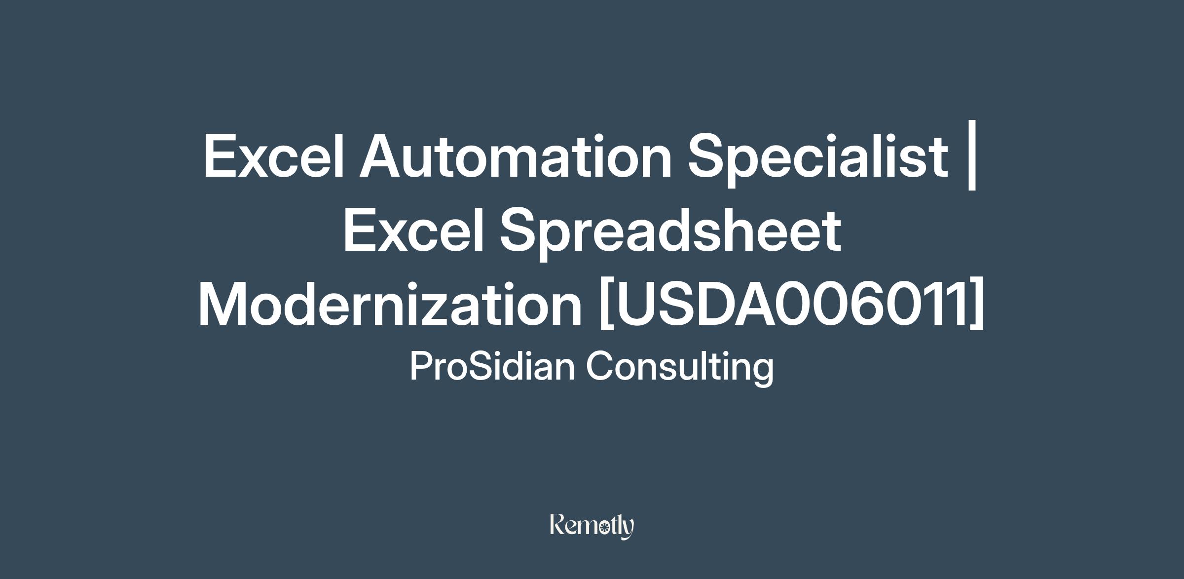 ProSidian Seeks a Excel Automation Specialist | Excel Spreadsheet Modernization [USDA006011] - DPLH Est.: 2080 Hrs. ST | 0 Hrs. OT on a Exempt [1099] Technical Element Basis Engagement Team | Analyst 5 Labor Category - High Level Exempt [1099] Professional aligned under services related to NAICS: 541620 - DPLH Est.: 2080 Hrs. ST | 0 Hrs. OT on a Exempt [1099] Technical Element Basis located CONUS: Washington, DC, and Reston, Virginia Across The Mid Atlantic Region supporting responsible for overseeing farming, ranching, and forestry industries, as well as regulating aspects of food quality and safety and nutrition labeling.