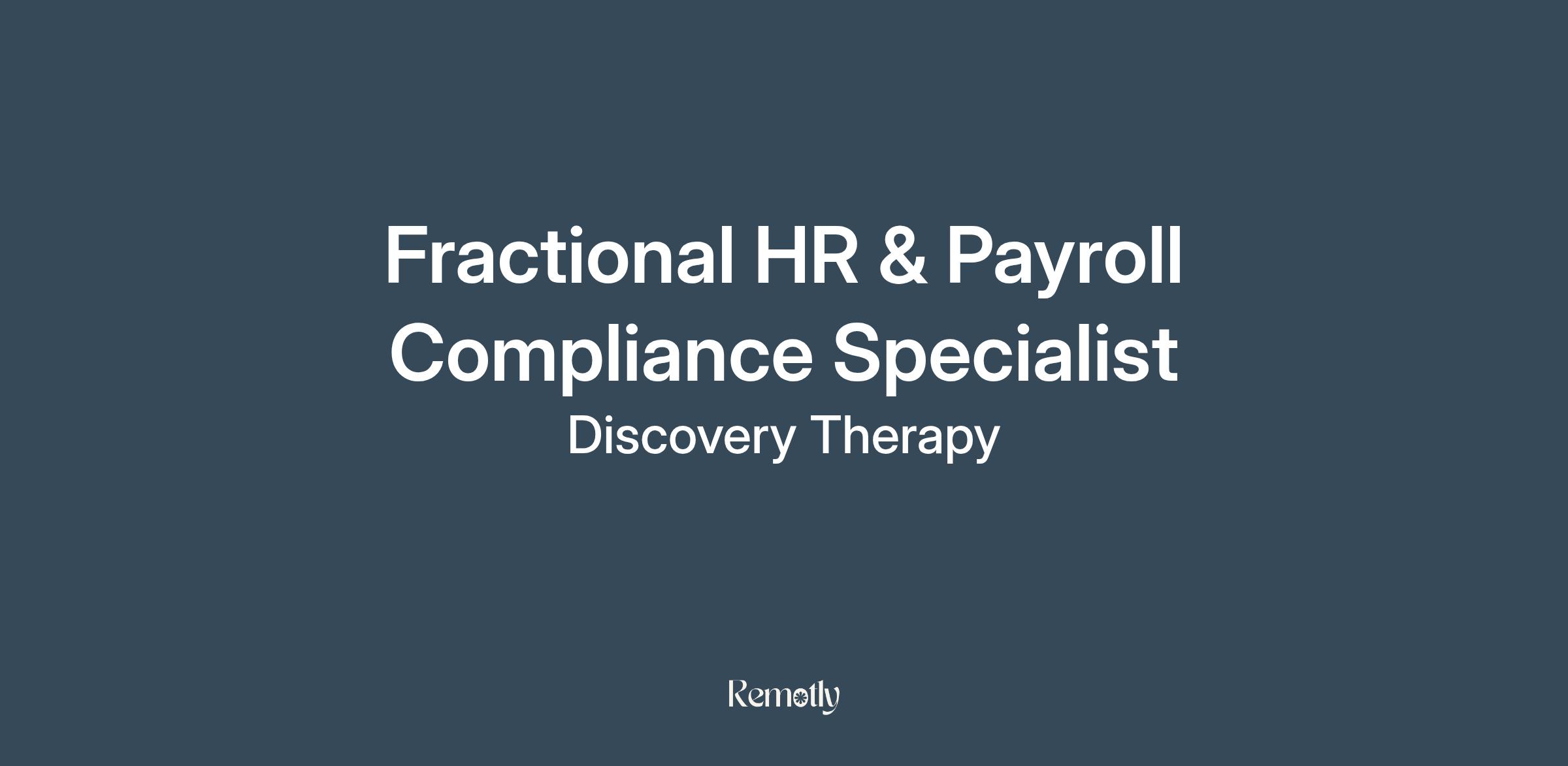 Fractional HR & Payroll Compliance Specialist (REMOTE)Part-Time | 1–3 hours/week | $13–$15/hour | 1099 ContractorDiscovery Therapy is seeking a
