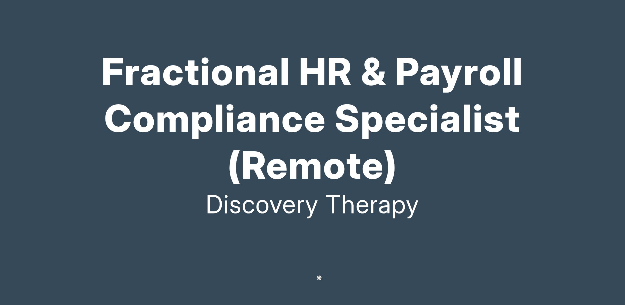 Fractional HR & Payroll Compliance Specialist (Remote)Part-Time | 1–3 hours/week | $13–$15/hour | 1099 ContractorDiscovery Therapy is seeking a