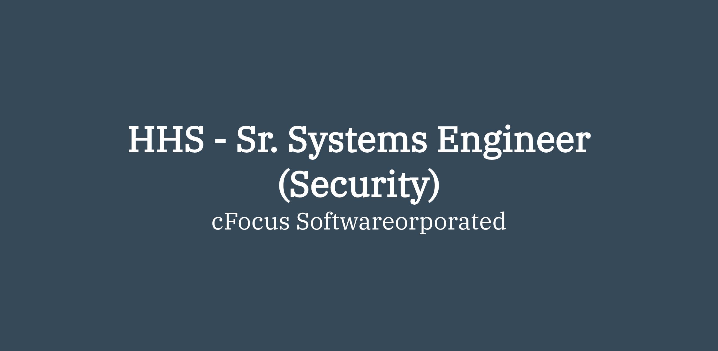 cFocus Software seeks a Sr. Systems Engineer (Security) to join our program supporting the Department of Health and Human Services (HHS) This position is remote. This position requires the ability a Public Trust clearance.Qualifications:- Bachelor’s degree in Information Technology, Engineering, Cybersecurity, or related field.
