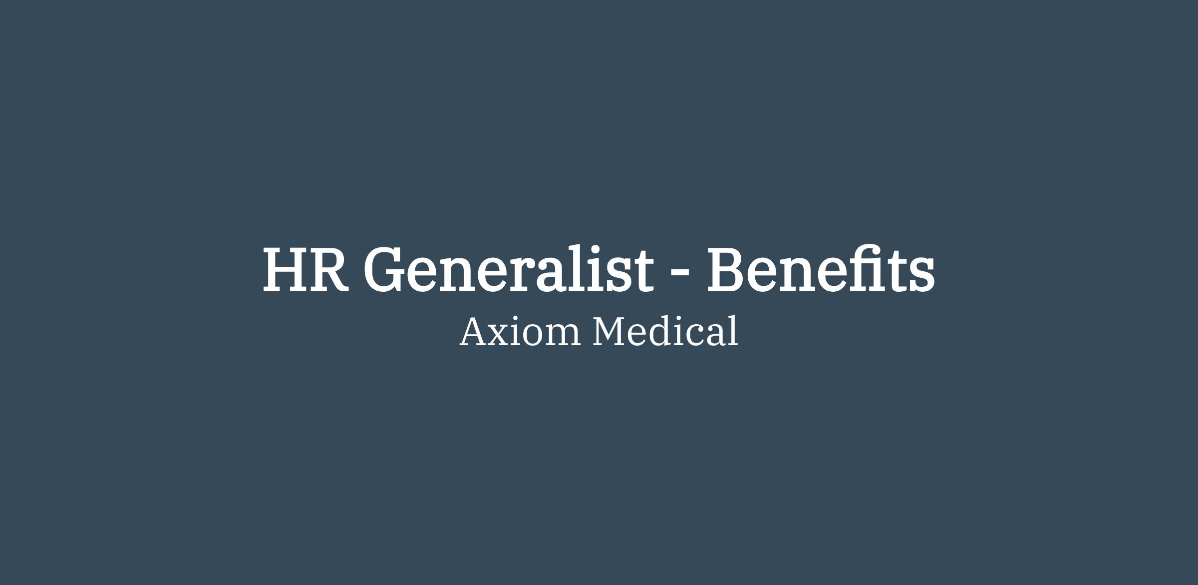 Axiom Medical Consulting is seeking an Human Resource Generalist to join our team. The Human Resource Generalist is responsible for various functions of the Human Resource department, with a heavy emphasis on onboarding, benefits, leave of absence, reporting, and administration of company policies.