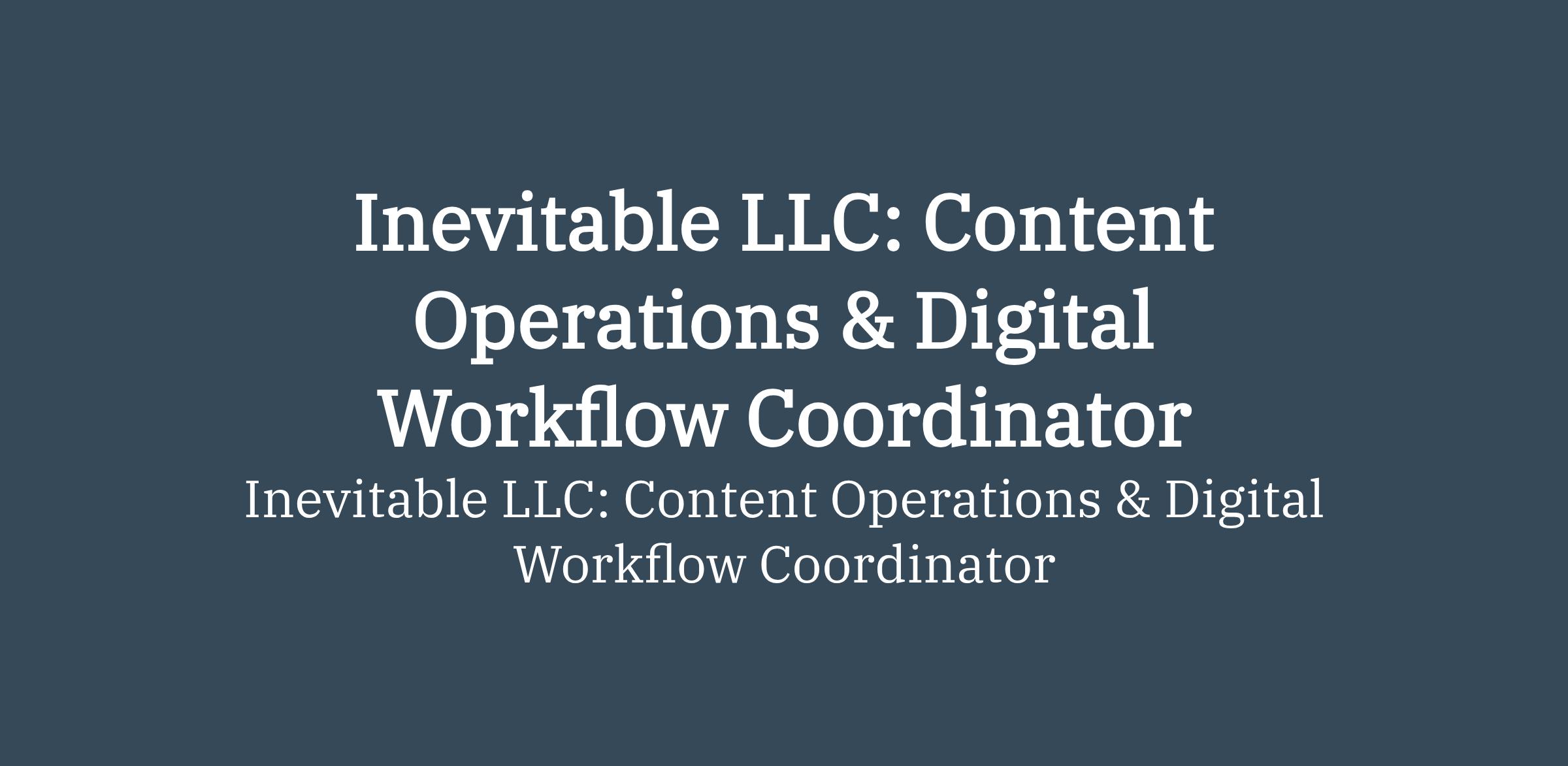 Inevitable LLC is seeking a highly organized Content Operations & Digital Workflow Coordinator to help coordinate the production, organization, and deployment of educational and marketing content across our digital platforms.