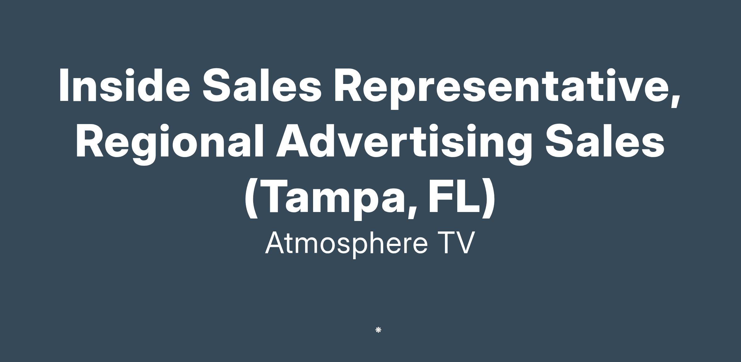 This is a remote position that reports to our Vice President of Regional Advertising Sales. Candidates must be based in the Tampa Metropolitan Area, for in-person client relationships and occasional team meetings.