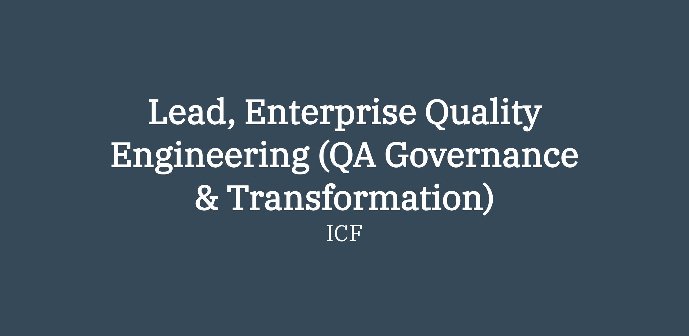 ICF is looking for a Lead, Enterprise Quality Engineering (QA Governance & Transformation) to support a large, mission-driven federal client as they modernize and standardize quality practices across a complex technology and business ecosystem. This role will operate at an enterprise level, partnering closely with senior IT and business leadership to assess current-state quality practices, define a future-state QA operating model, and drive adoption across multiple teams.