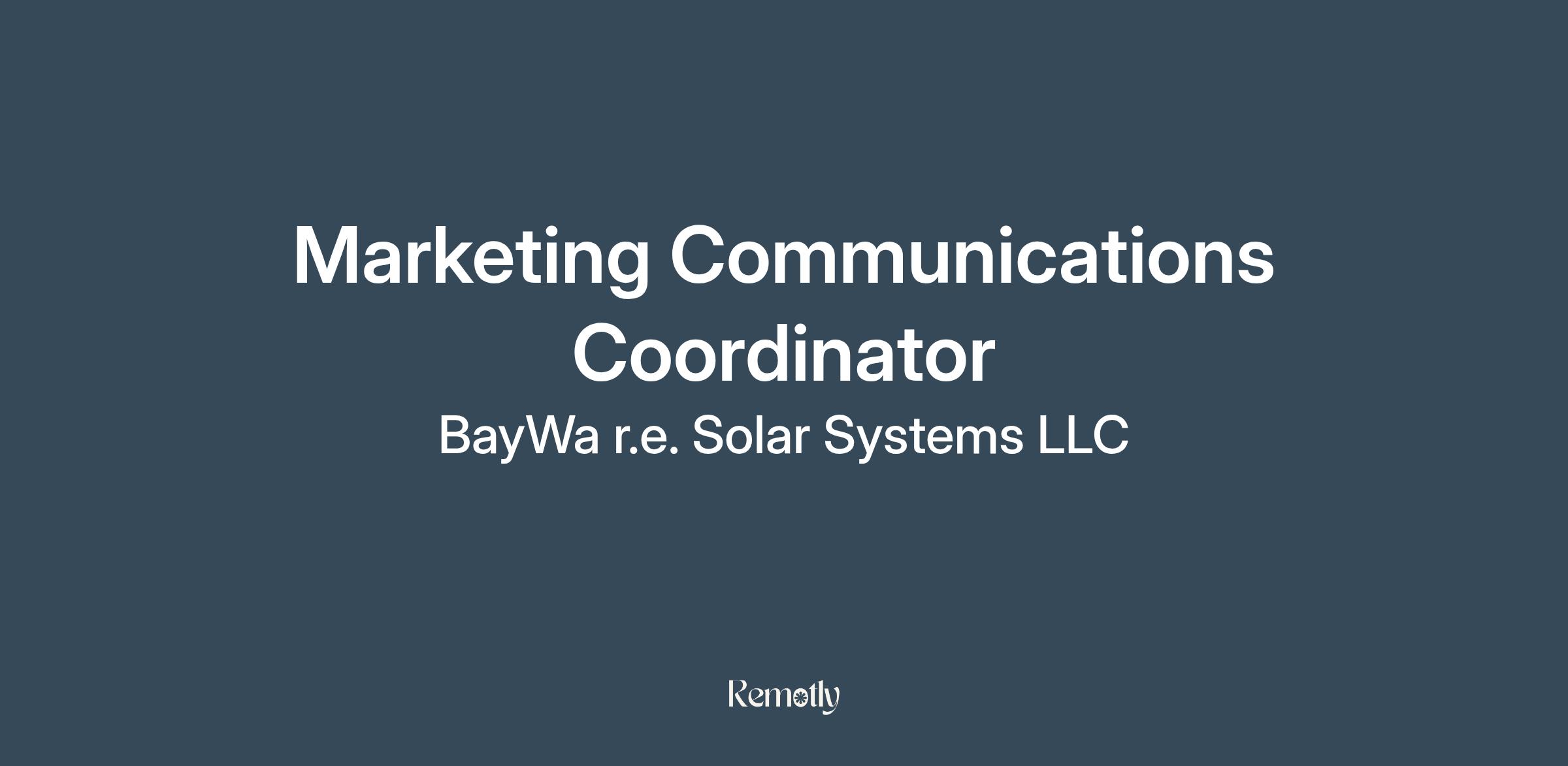 The Marketing Communications Coordinator is responsible for the copy, messaging, voice, and audience engagement across all channels for the marketing team at BayWa r.e. Solar Systems and works closely with the marketing team to develop effective communication that aligns with company goals. This role creates, guides, edits, and executes the company’s approach to external content through emails, website, social media and information sharing through the use of copy, video, audio, and in-person speaking formats.