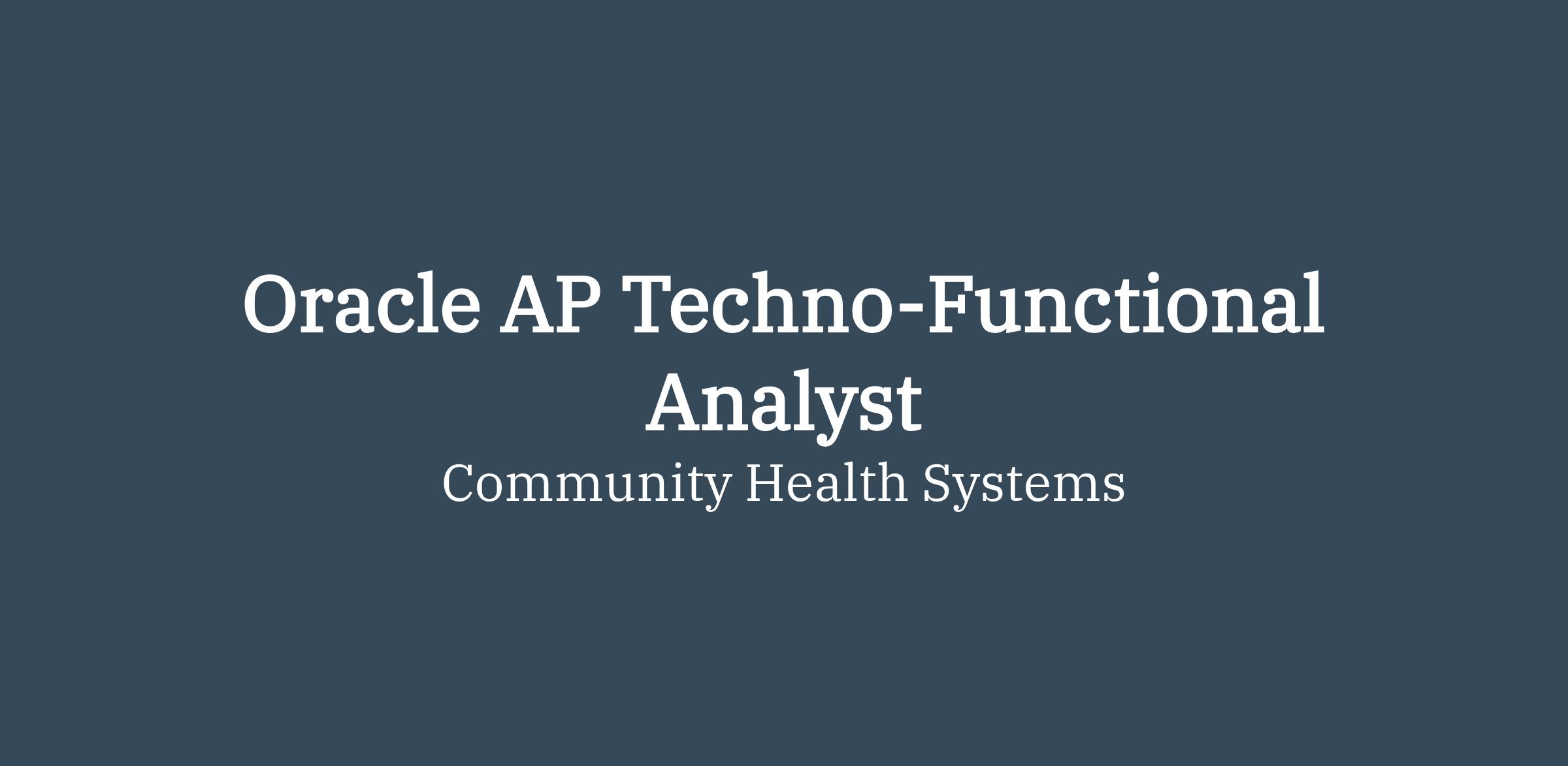 As an Oracle AP Techno-Functional Analyst at Community Health Systems (CHS) – Shared Business Operations, you’ll play a vital role in supporting our purpose to help people get well and live healthier by providing safe, quality healthcare, building enduring relationships with our patients, and providing value for the people and communities we serve. Our team members enjoy a robust benefits package including: