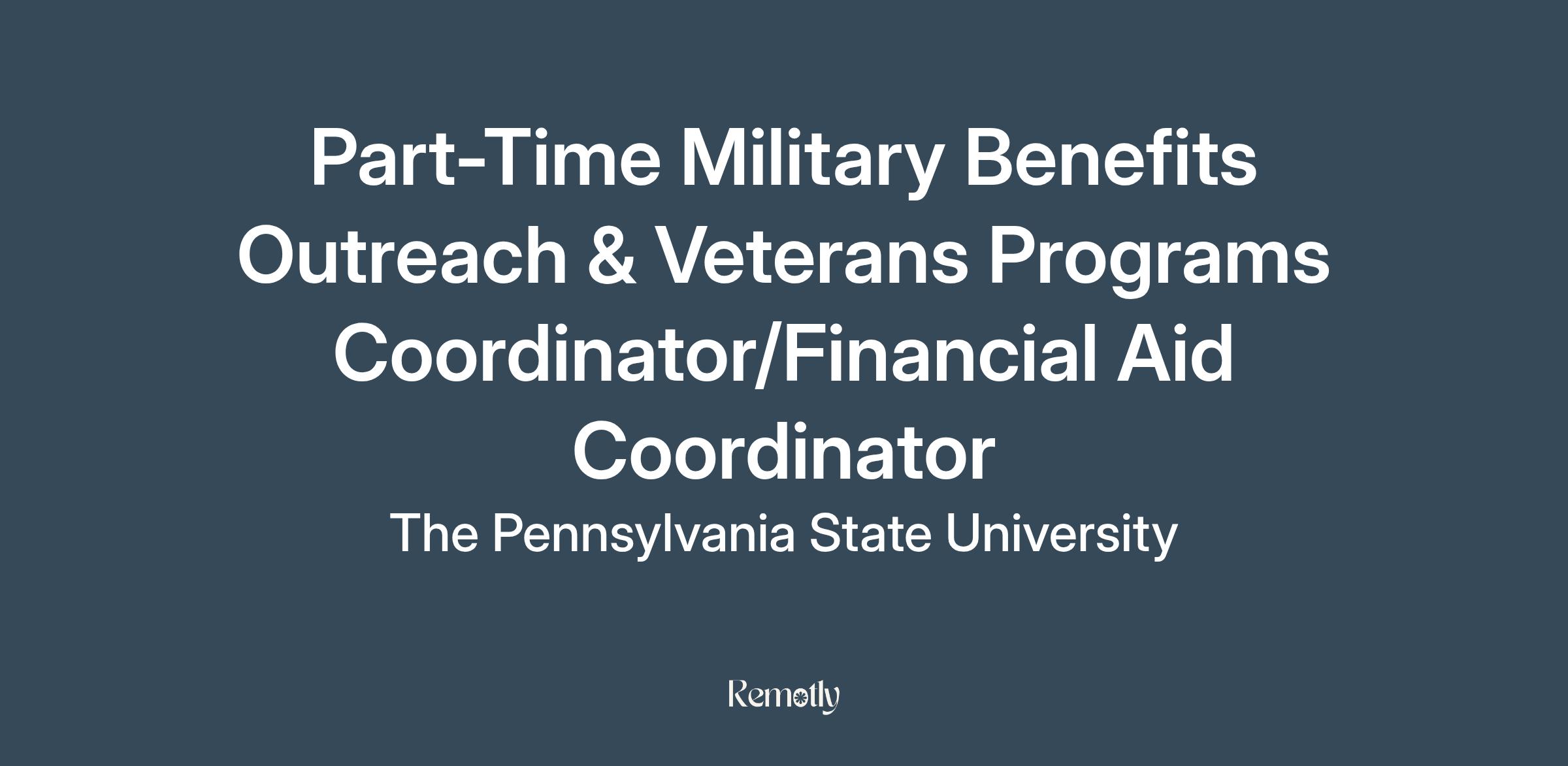 Penn State World Campus is currently accepting applications for a part-time Military Benefits Outreach & Veterans Programs/Financial Aid Coordinator - this is a remote position.