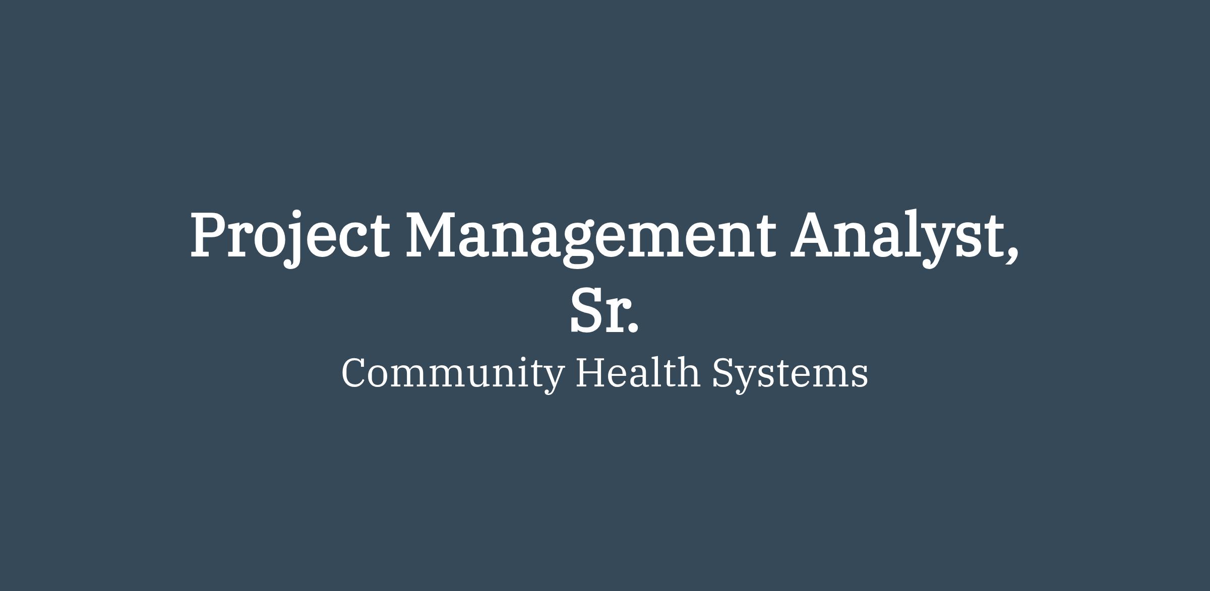 As an Project Management Analyst, Sr. at Community Health Systems (CHS) – Shared Business Operations, you’ll play a vital role in supporting our purpose to help people get well and live healthier by providing safe, quality healthcare, building enduring relationships with our patients, and providing value for the people and communities we serve. Our team members enjoy a robust benefits package including:
