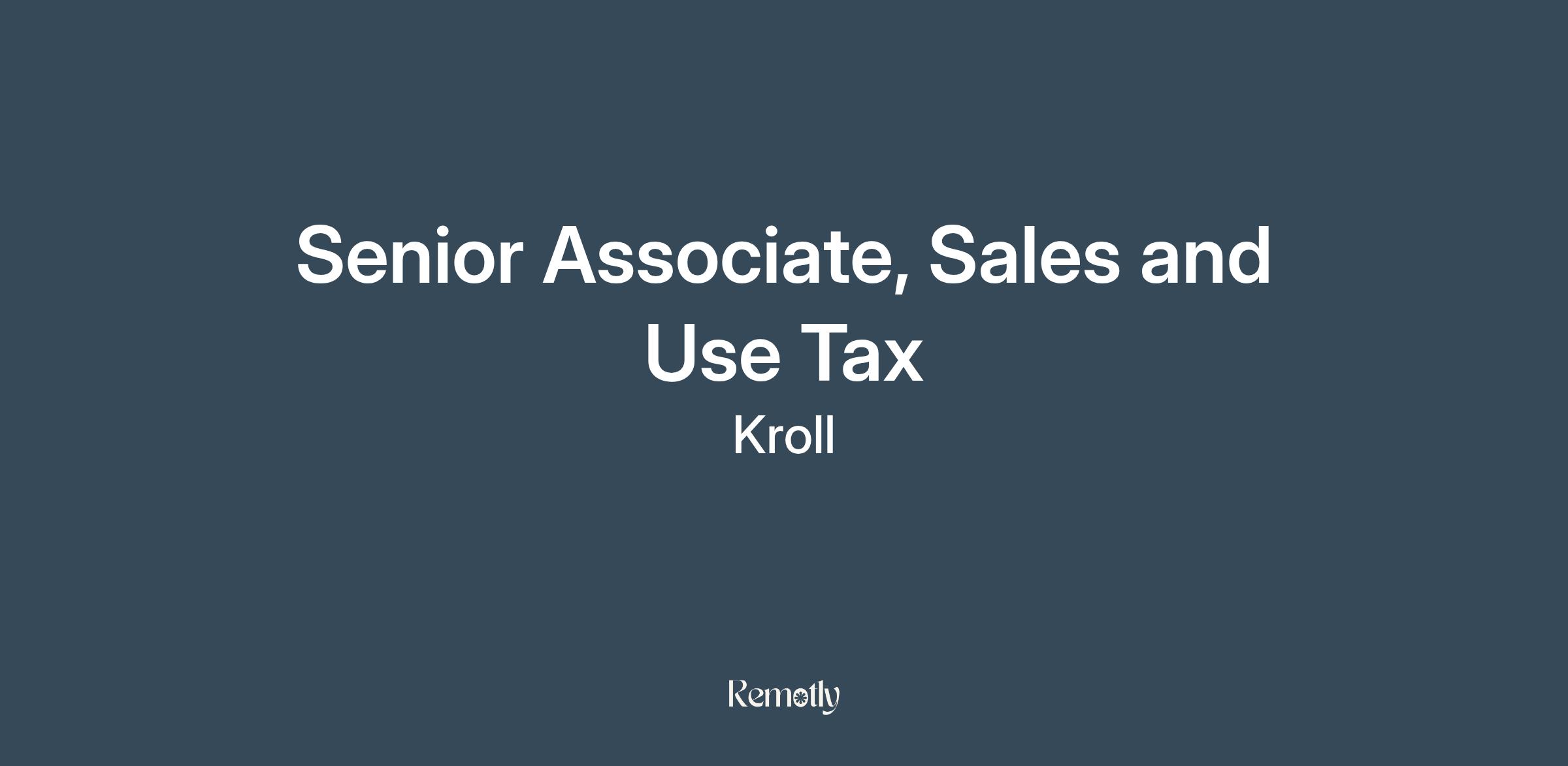 DescriptionKroll seeks a Senior Associate, Sales and Use Tax to join our indirect tax team. The role involves sales and use tax research, compliance support, and preparation of memoranda for large-scale tax projects. The ideal candidate is detail-oriented, organized, and able to work effectively in teams or independently. They should have a collaborative demeanor, a strong desire to learn, and intellectual curiosity.