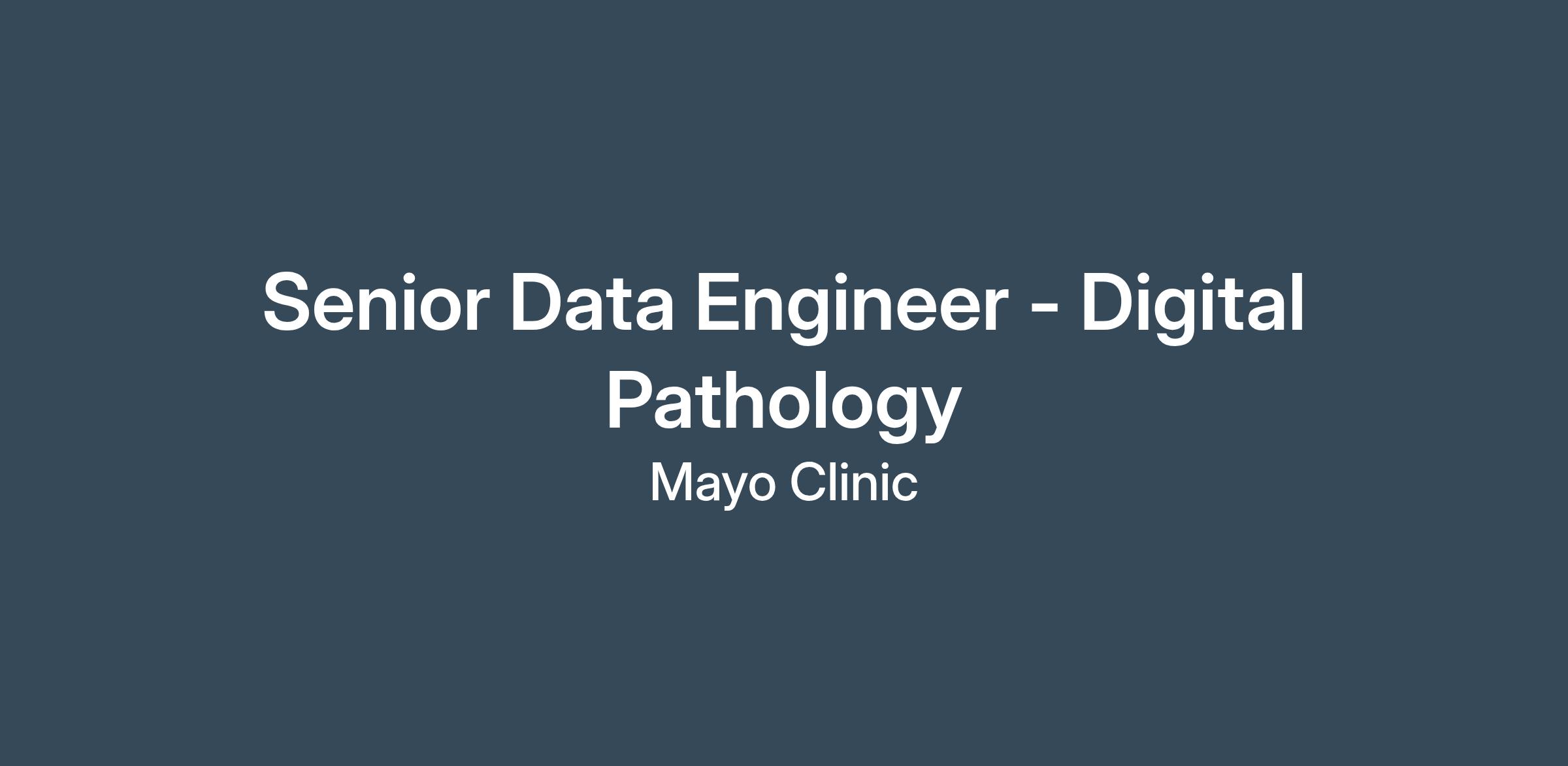 The Digital Biology team is the advanced technology group for Mayo Clinic Digital Pathology. We are seeking a Senior Data Engineer to execute the technical vision for our shared engineering pod. In this role, you will build, deploy, and optimize the scalable, multimodal data pipelines (pathology, -omics, imaging) that feed our biological foundation models and AI Virtual Cells. Working directly with AI pods and bioinformaticians, you will take ownership of data reliability and velocity, transforming complex raw biological information into high-quality training assets used to develop life-changing diagnostic tools.