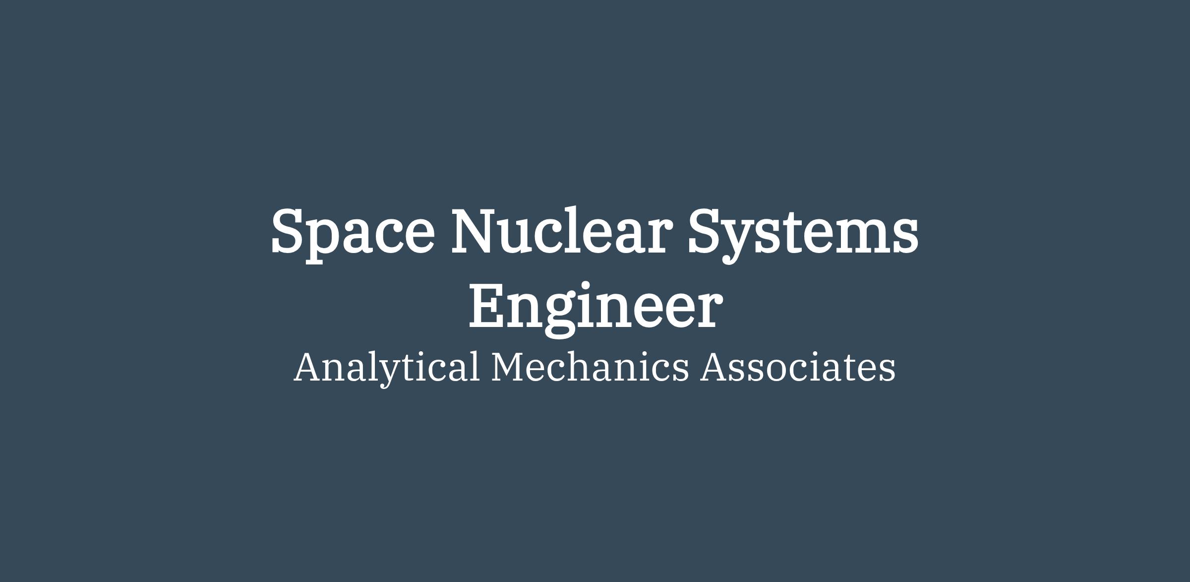 Analytical Mechanics Associates, Inc. (AMA) is seeking a Space Nuclear Systems Engineer for our Denver, CO or Huntsville, AL location. Possibility for hybrid or remote work.