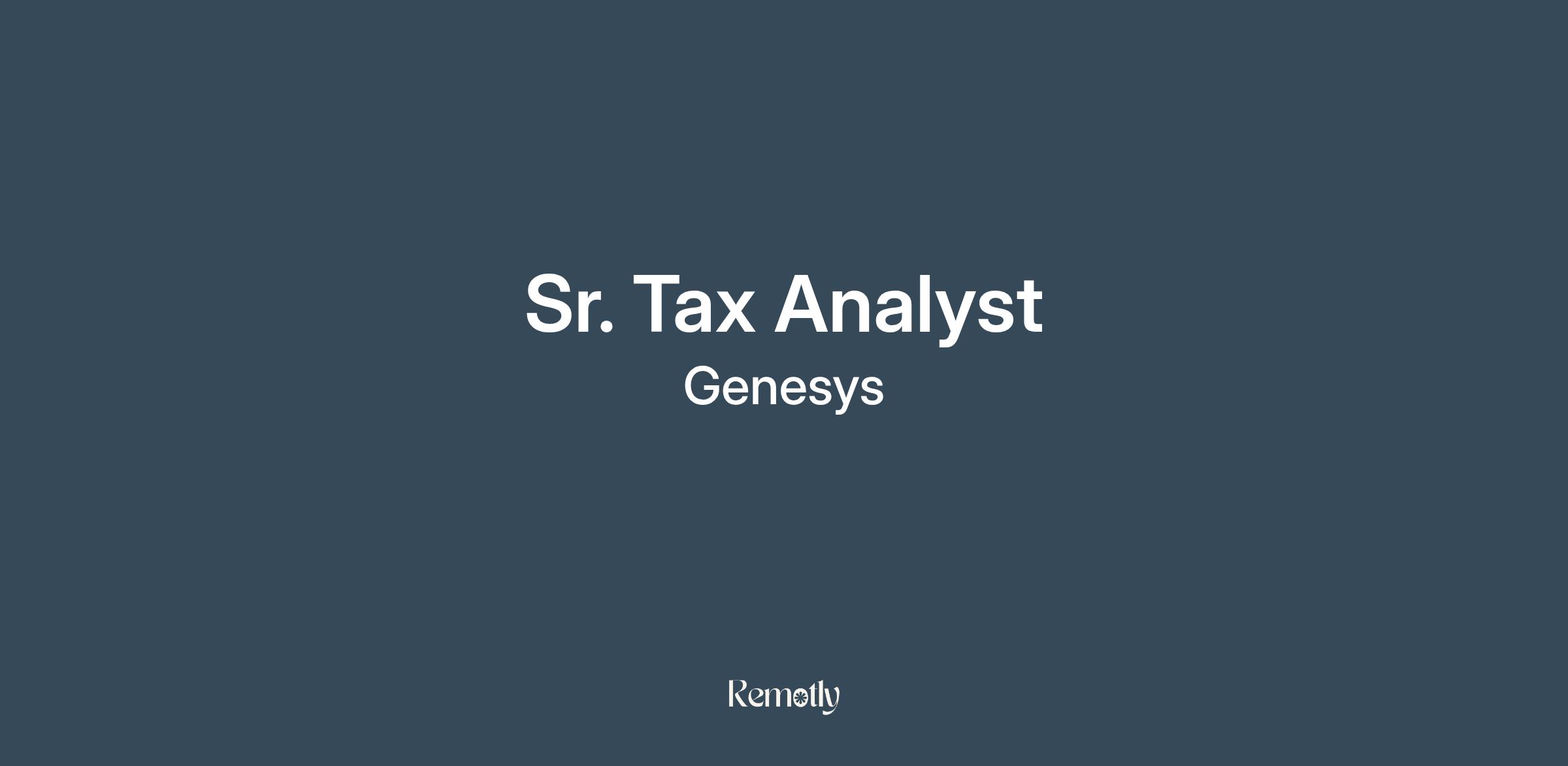 Genesys is seeking a highly motivated and experienced Senior Tax Analyst to join our growing Global Tax Team. This role will report to the Senior Director, Global Tax Accounting and Reporting, and will assist with various areas of income tax including compliance, research & planning, and tax accounting.