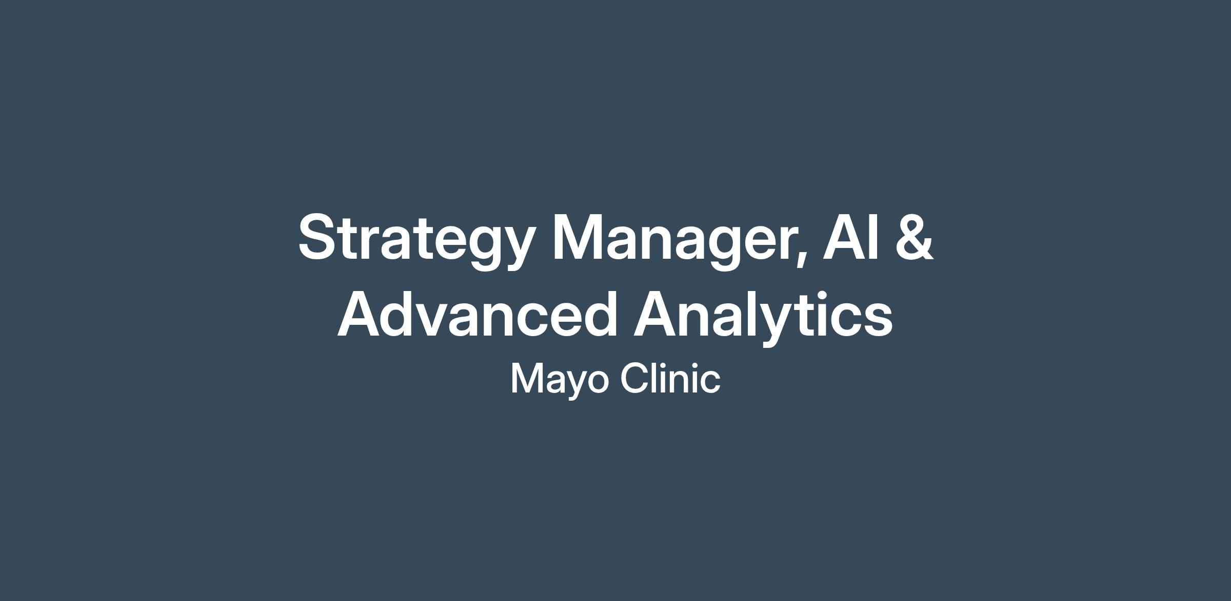 Mayo Clinic’s Strategy Department is seeking a Strategy Manager with AI and advanced analytics expertise to serve as an internal consultant, thought partner, and trusted advisor to senior leaders. This role would serve as team leader for Mayo Clinic’s Internal Strategy Consulting Team and focuses on helping leaders understand, prioritize, and act on opportunities enabled by artificial intelligence and data-driven capabilities.