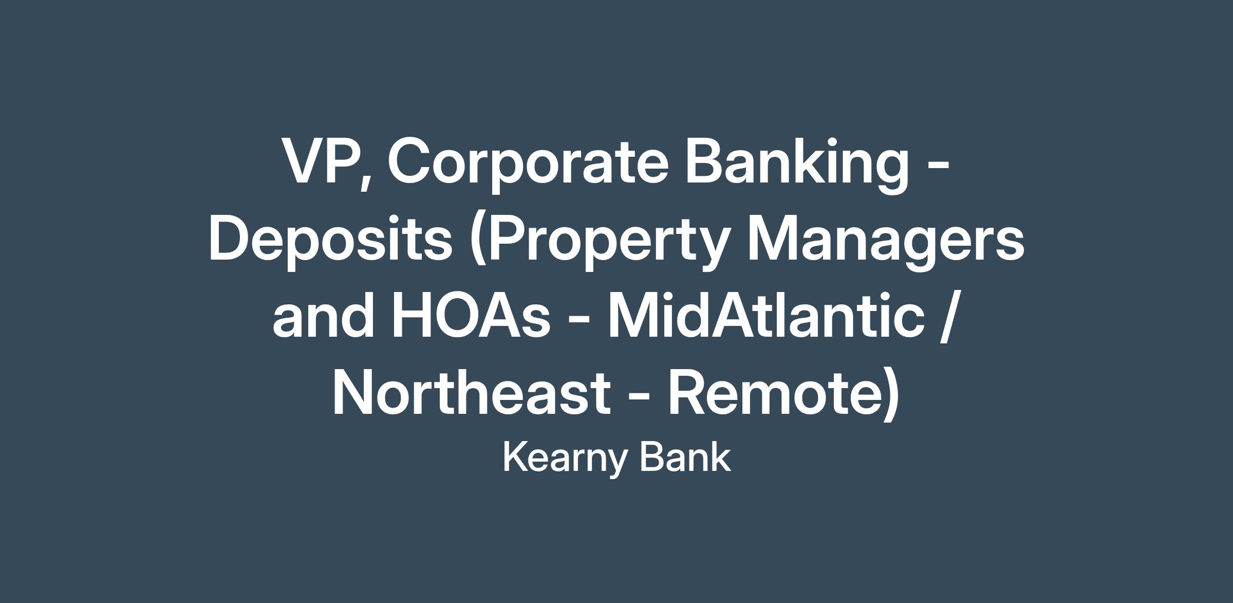The VP, Corporate Banking - Deposits (Property Managers and HOAs) will focus on deposit growth and relationship management within Corporate Banking. The VP will be responsible for establishing a portfolio of Corporate Banking clients, specifically targeting deposit relationships, as well as identifying cross-sell opportunities with other Kearny Bank financial products. In addition, the role will deliver tailored financial solutions that drive revenue and client satisfaction, focusing on Corporate deposit growth with clients generally ranging in size from $5 million to $25 million in annual revenue, including small to mid-size business and nonprofit organizations. The VP will collaborate and execute directives from Executive Leadership, Marketing, Retail Banking, Treasury Management, Commercial Lending, and Digital Banking to ensure sustainable deposit growth aligned with the Bank’s mission and community values.